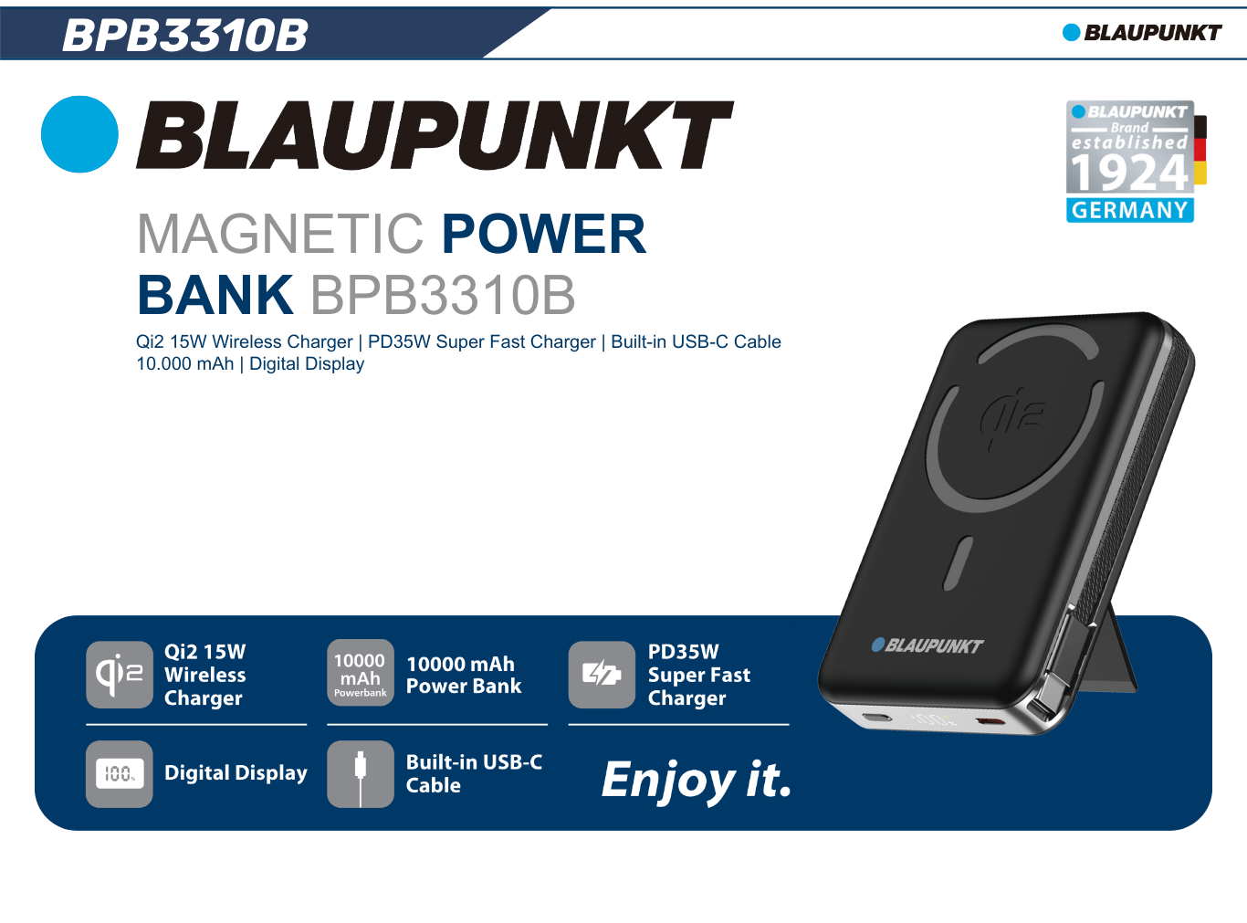 Pin SPD Từ Tính Blaupunkt BPB3310, 10.000mAh, PD35W, Qi2, LCD, Kèm cáp Type-C